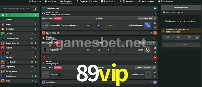 O 89vip oferece uma grande seleção de opções de apostas em e-sports com probabilidades competitivas